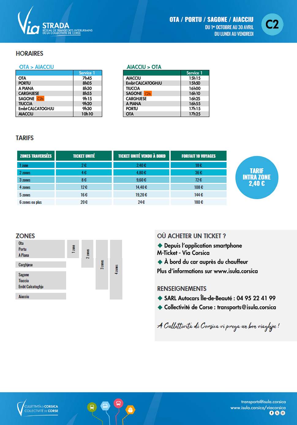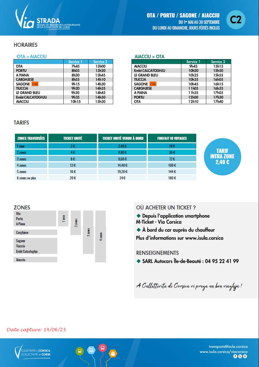 Les billets sont en vente par l'intermédiaire de l'application M-Ticket Via Corsica ou auprès du chauffeur.